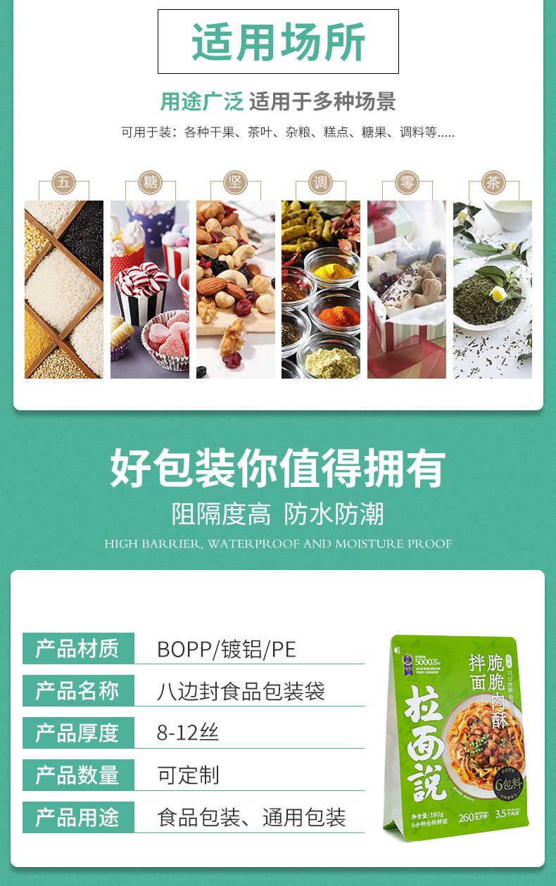產(chǎn)品名稱:八邊封食品包裝袋 產(chǎn)品材質(zhì):PET/AL/PE BOPP/VMPET/PE 厚度推薦:8絲-10絲產(chǎn)品名稱:八邊封食品包裝袋