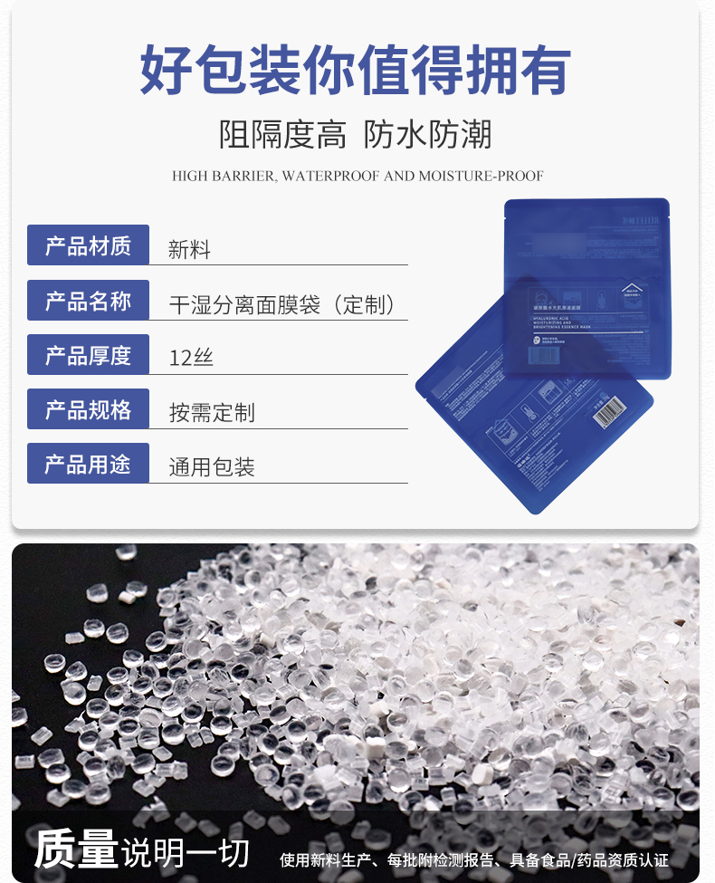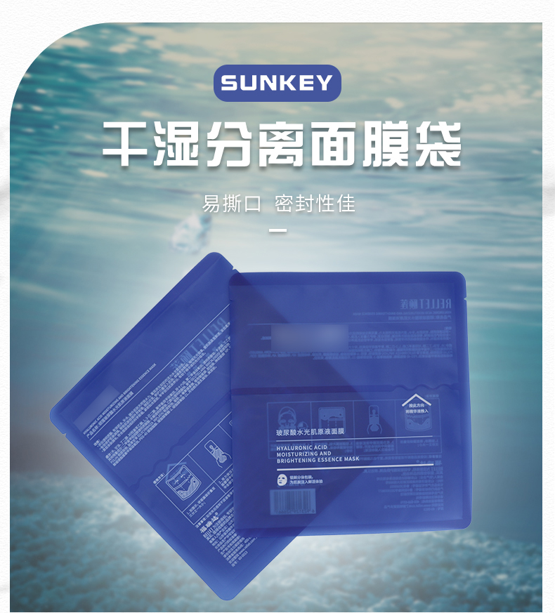 產(chǎn)品材質(zhì):新料 名稱:干濕分離面膜袋 厚度:12絲 規(guī)格:按需定制 用途:日化品包裝 膜液分離的干濕分離面膜袋技術(shù)可以,使精華液可以獨立包裝,保證穩(wěn)定性更優(yōu)的情況下,還能減少某些添加劑的使用。面膜在使用前十幾秒才解鎖“浸泡”,既杜絕面膜紙中化工成分的析出,又能最大程度地保證活性成分的被最大程度地吸收,新鮮程度是傳統(tǒng)浸泡式面膜無法比擬的。