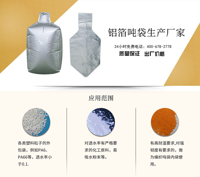 噸袋鋁箔袋主要應用于對于內容物有高阻隔要求以及耐高溫要求,粒如尼龍粒子(例如PA6、PA66)、填充料、易吸水粉末、化工原料等產(chǎn)品。
