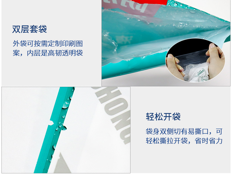 袋中袋使用效果:雙層套袋的袋中袋形式,讓內(nèi)容物在運輸過程中在碰到外部尖銳的物體時,即使第一層外袋被刺破,但由于兩層袋子